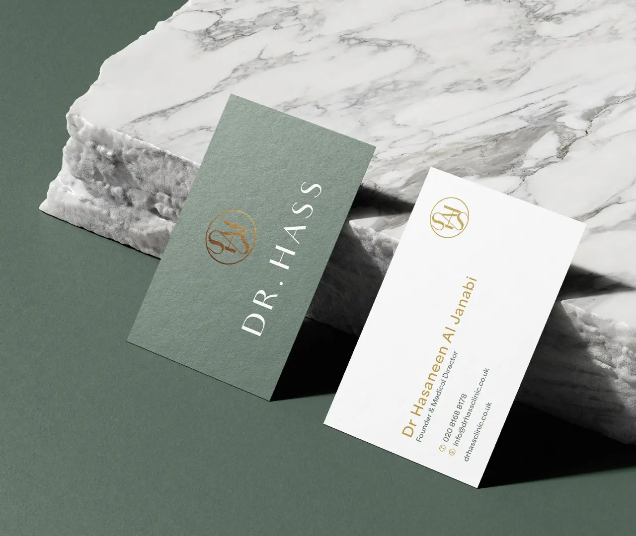 We designed the brand identity for Dr. Hass, using the letters in his surname to create a timelessly stylish icon within a circle, which then enables the icon to be bespoke enough to stand alone from the wordmark. The letter ‘S’ makes up natural swirls within the icon, giving the brand a calm and luxuriously elegant style.