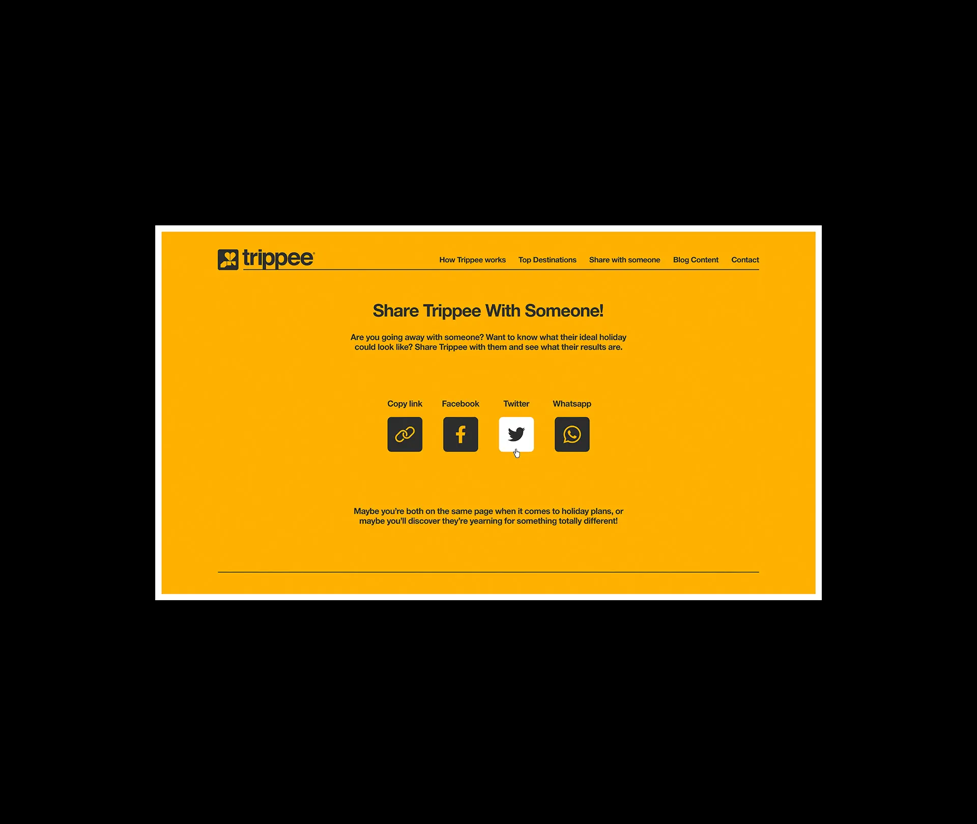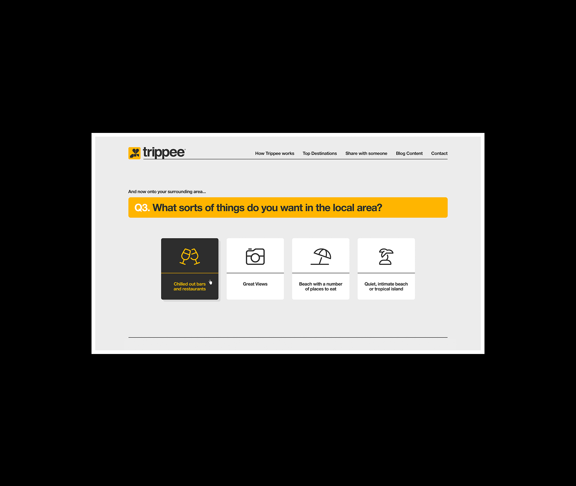 When discussing the project and its aims, we realised that speaking to someone about a holiday was always far easier than deciding plans yourself on your own especially when you didn’t know your destination. That dialogue, the back and forth of asking and answering questions, became the inspiration for how the site would work. Trippee asked a list of questions which would narrow down options for a traveller. Would they like to take the kids? Would they want a quiet time, or something to get the blood pumping? Drinks by the pool, or a helicopter flight around a volcano? With each answer, Trippee eliminates the irrelevant and focuses on the options that would be more in line with the user’s desires. Answers could be a little vague if that helps the user, and if more than one ideal destination becomes clear then the site would offer a number of results. The results can be shared, and if sent to a travel partner, perhaps their result would be different due to how they responded with their own needs.